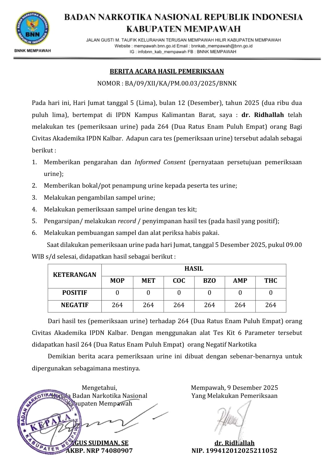 Kegiatan tes urin ini dilakukan secara menyeluruh kepada praja, aparatur sipil negara, serta unsur pendukung lainnya di lingkungan Institut Pemerintahan Dalam Negeri (IPDN) Kampus Kalimantan Barat. Proses pemeriksaan berlangsung dengan pengawasan langsung dari tim BNN guna menjamin objektivitas serta akurasi hasil pemeriksaan.